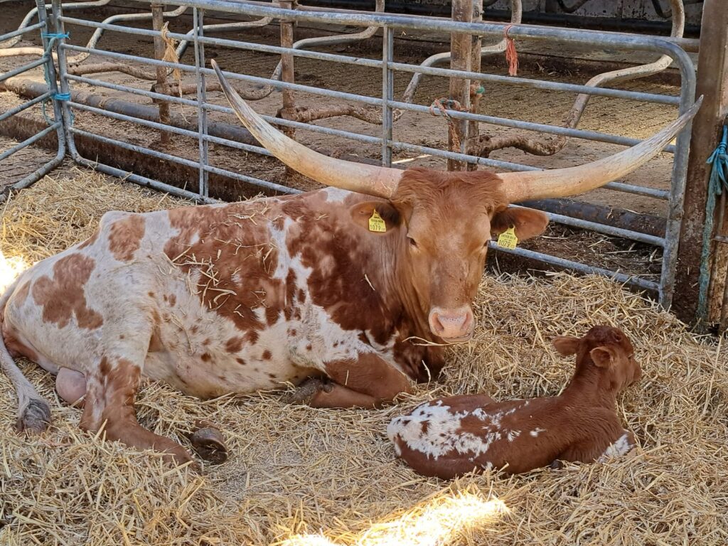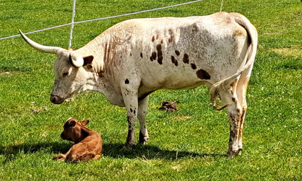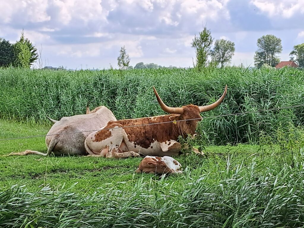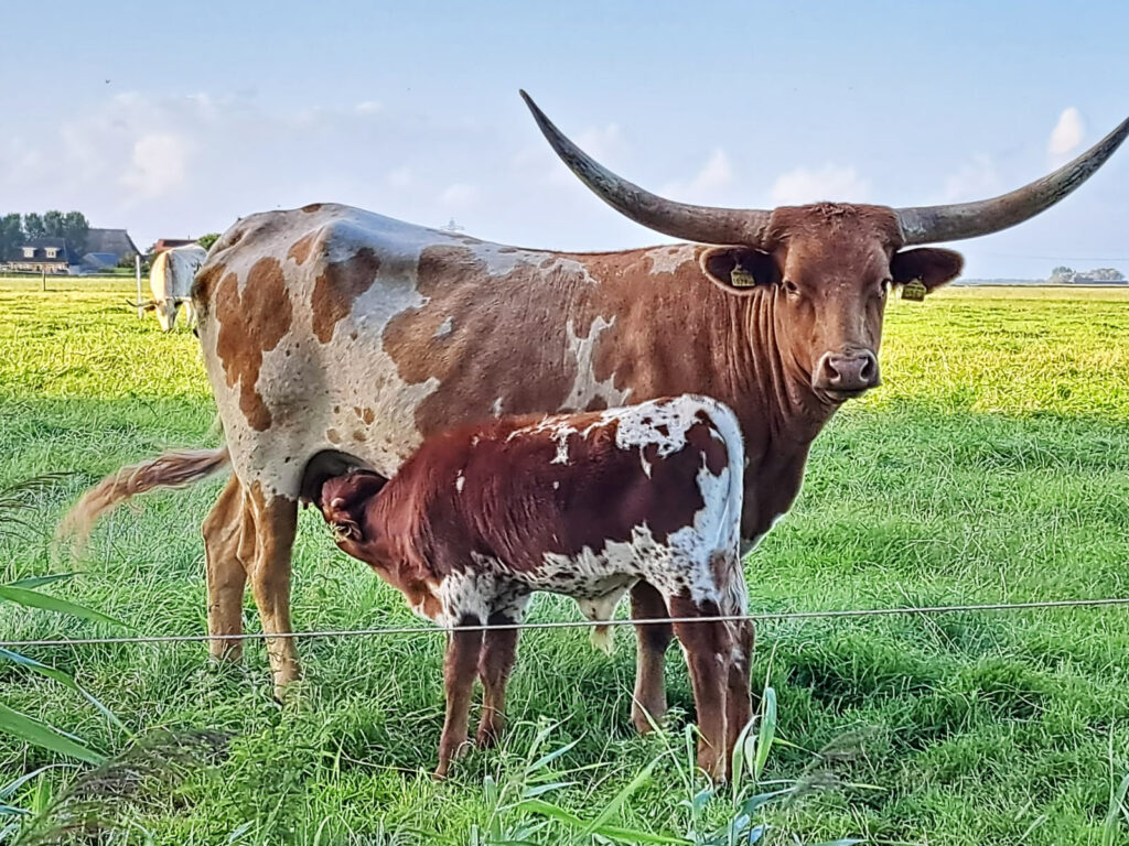 Zo’n 10 jaar terug kwamen we op internet een prachtig ’getekende’ stier, genaamd Tabasco tegen. Deze stier van het Texas Longhorn ras, zorgde voor prachtig gevlekte, gestippelde kalfjes. Geweldig! Onze interesse was gewekt en een wens werd geboren: wat zou het geweldig zijn om zelf deze dieren te houden en hier mee te fokken. Met onze omschakeling naar natuur inclusieve landbouw is ook onze droom uitgekomen. In September 2021 hebben we onze eerste koppel Texas Longhorns, bestaande uit 5 nog jonge vrouwelijke dieren en een stier, kunnen aanschaffen.